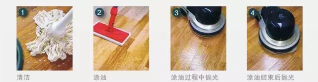 涂油结束后抛光用清洁、干燥的棉布擦拭地板表面,抛光后表面无多余的维护油。用抛光机抛光的地板,在20摄氏度条件下干燥4小时后小心投入使用,如果是手工抛光,则于24小时后投入使用,在24小时的干燥过程中请勿接触水。